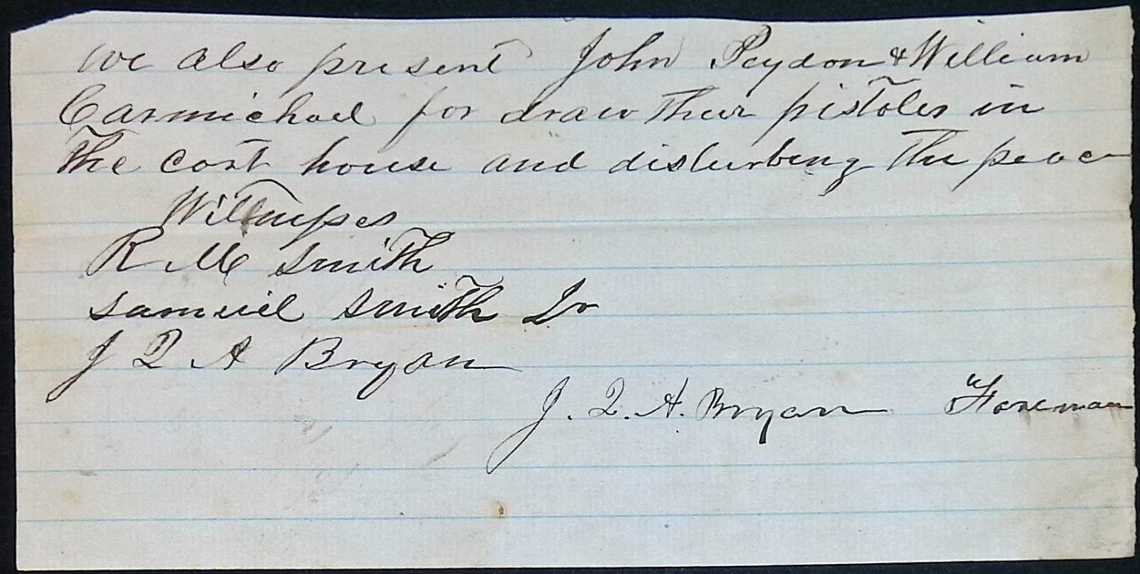 court.  It reads, “We also present John Peydon and William Carmichael for